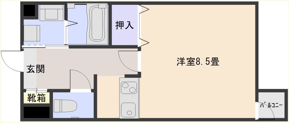 8.5畳の広さもあるシンプルで対面キッチンの1kタイプ♪