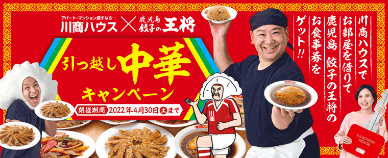 対象期間中に、川商ハウスでご成約頂いたお客様に、鹿児島餃子の王将で使えるお食事券をプレゼント!